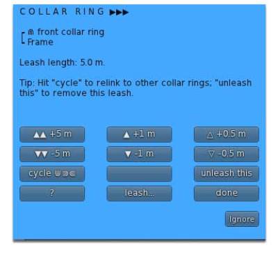 - click a LULU Leash Ring – if your pet is currently leashed, you will get get the menu for that leash/collar ring. If unleashed, your pet will now be leashed, and you will get the Collar Ring Menu for that leash/collar ring.